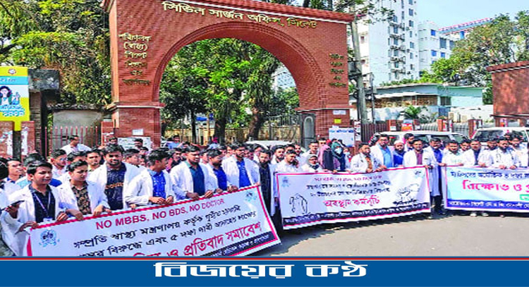 এমবিবিএস ও বিডিএস ছাড়া অন্য কাউকে চিকিৎসকের স্বীকৃতি না দেওয়াসহ পাঁচ দফা দাবিতে টানা তৃতীয় দিনের মতো সিলেটে শিক্ষানবিশ (ইন্টার্ন) চিকিৎসকদের কর্মবিরতি অব্যাহত রয়েছে। বুধবার দুপুরে ওসমানী মেডিকেল কলেজ প্রাঙ্গনে অবস্থান কর্মসূচী পালন করেন ইন্টার্ন চিকিৎসকরা। এ সময় তাদের আহবানে মিডলেভেল এবং মেডিকেল কলেজের শিক্ষকরা কর্মসূচিতে অংশগ্রহণ করেন।